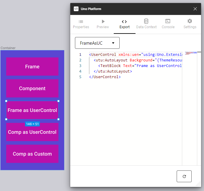 The Export tab is a powerful tool within the Uno Figma Plugin, offering the ability to inspect generated code and export it for development purposes.