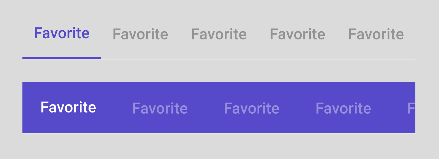 PrimaryColorfor the selectedTabBarItemcontent and OnSurface at 38% opacity for unselectedTabBarItemcontent. - Filled surface with