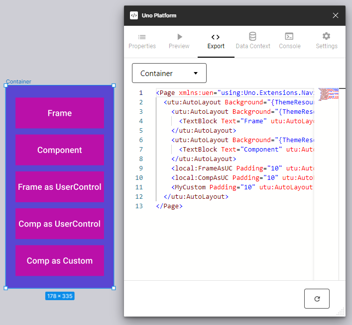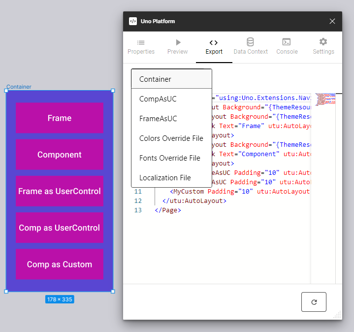 The Export tab is a powerful tool within the Uno Figma Plugin, offering the ability to inspect generated code and export it for development purposes.